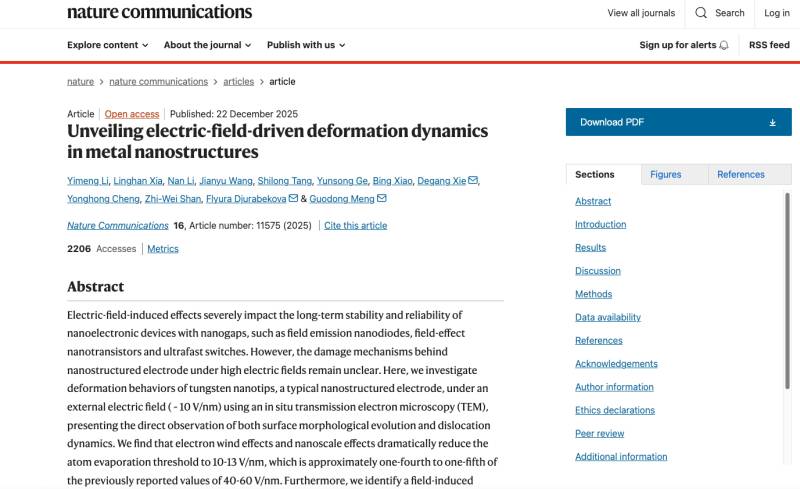 随着纳米加工与微纳电子器件的快速发展,具有纳米间隙和尖端电极结构的器件在高速开关、场发射与极端环境应用中展现出独特优势。高电场条件下,器件可实现低功耗、高响应速度的电子输运模式,但与此同时,电极尺度不断缩小使其更易受到表面能、尺寸效应及电子输运行为变化的影响,器件稳定性逐渐成为制约工程化应用的关键因