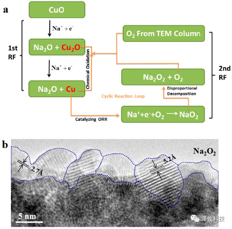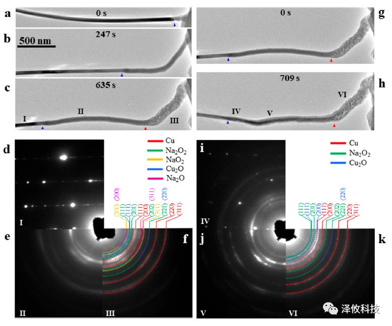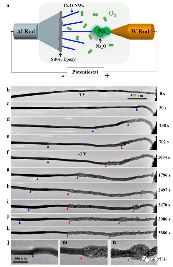 5月9日的《Nano Letter》期刊再次报道了泽攸科技的原位测量系统在固态氧钠电池研究中的应用(DOI: 10.1021/acs.nanolett.8b00894)。在这一研究中,CuO纳米线/O2作为电池的空气阴极,Na作为电池的阳极。结合球差校正环境透射电镜,研究者们原位观测到了在通电之后固态氧钠电池中发生的化学反应。整个化学反应过程分为两个阶段:(1)CuO转化为CuO2,紧接着又转化为Cu;(2)NaO2形成,并紧接着又转化为Na2O2和O2。CuO纳米线在这一过程中发生明显的膨胀。值得一提的是,整个化学反应过程没有生成碳酸盐。这一研究成果对于理解应用无碳空气阴极的固态钠氧电池非常重要。